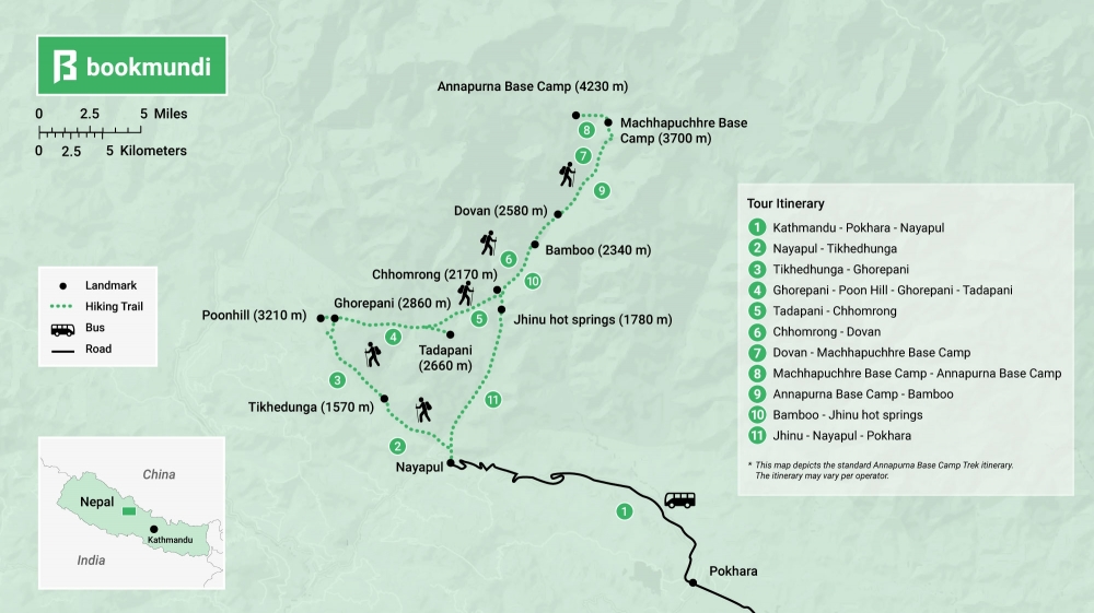 - Max elevation: 4,320 m, Annapurna Base Camp