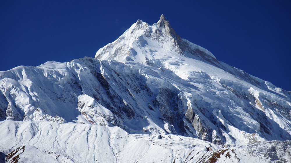 View of Mt. Manaslu, the eighth highest mountain in the world. The Manaslu Circuit trek circumvents Mt. Manaslu.