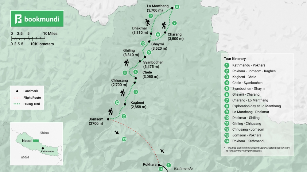 - Restricted Permits: Yes. You have to be minimum 2 trekkers and accompanied by a Nepali Guide or Porter. The Restricted Permit for Upper Mustang costs USD 500 for up to 10 days and USD 50 for each day hereafter.